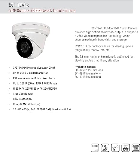 Day/night functionality Smart IR, up to 98 ft (30 m) IR distance 2D/3D DNR (Digital Noise Reduction) Ultra 265, H.265, H.264, MJPEG ROI (Region of...