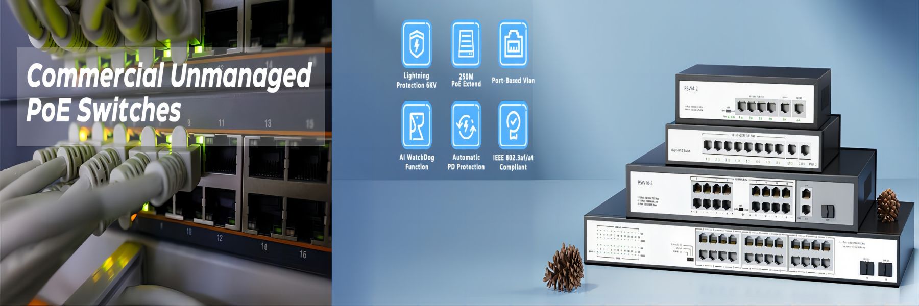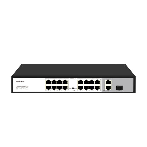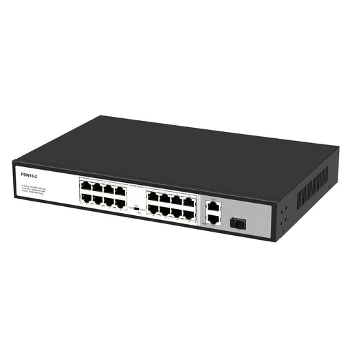 View full details16 Port 10/100Mbps PoE+ Switch with 2 Gigabit Uplink Ports, Up to 30W Per Port, Total Budget 250W, 803.af/at Compliant, Extend Mode, Rack Mount