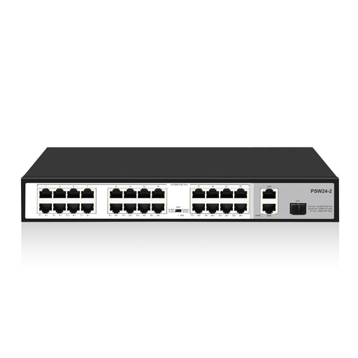 View full details24 Port 10/100Mbps PoE+ Switch with 2 Gigabit Uplink Ports, Up to 30W Per Port, Total Budget 250W, 803.af/at Compliant, Rack Mount