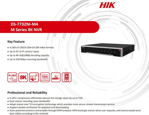 View full detailsHikvision DS-7732NI-M4 32 Channel 8K NVR Network Video Recorder up to 32MP, Dual LAN Ports, Dual 4K HDMI, Hard Drive Not Included, NO PoE Camera Port, Compatible with Hikvision System