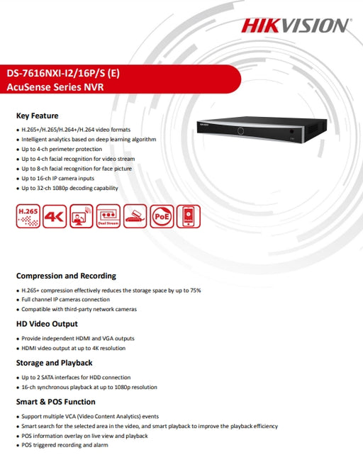 16-ch 1U 16 POE AcuSense 4K NVR H.265+/H.265/H.264+/H.264 video formats Intelligent analytics based on deep learning algorithm Up to 4-ch peri...