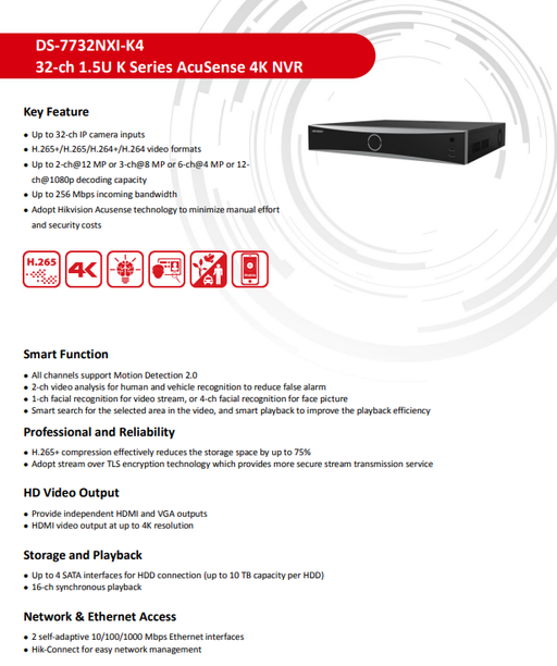 View full detailsHikvision DS-7732NXI-K4 32 Channel 4K ACU-Sense NVR(No PoE), Human&Vehicle Detection, Facial Recognition, Up to 12MP Recording, Compatible with Hikvision IP Camera, 4 SATA & 2-Way Audio, H.265+ (No HDD)