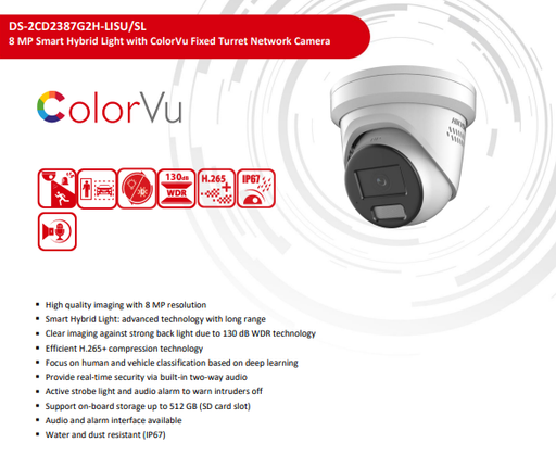 Hikvision DS-2CD2387G3-LIS2UY/SL 8MP Strobe Light & Audible Warn Color-Vu 3.0 Fixed Turret PoE IP Camera, Smart Hybrid Light, Acu-sense 3.0, Two-Way Audio, HikAI-ISP Noise Reduction, Anti-Corrosion Design 2.8mm