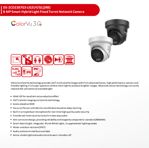 8 MP Smart Hybrid Light with ColorVu Fixed Turret Network Camera HikAI-ISP for excellent noise reduction effect 24/7 colorful imaging via Color...